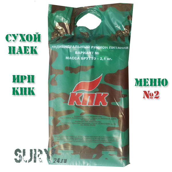 ИРП КПК - это полноценный индивидуальный рацион питания, производимый на Кировском комбинате. Рассчитан на 1 человека на 1-2 суток. Меню номер 2.