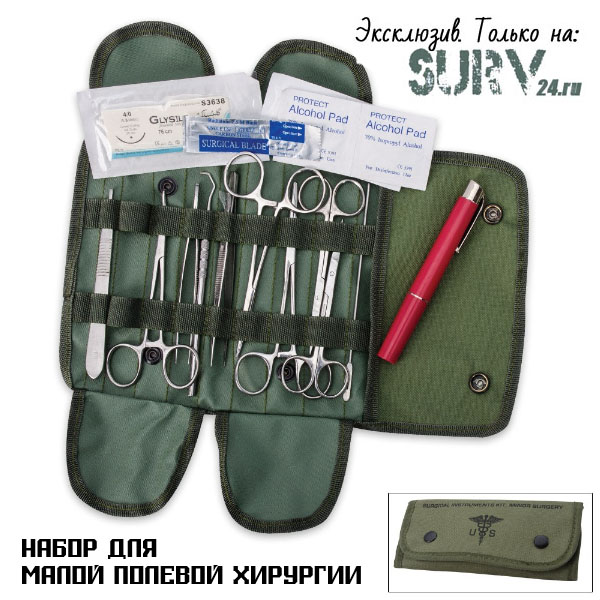 Набор содержит все необходимые инструменты, входящие в состав малого армейского хирургического набора. Подходит для операций легкой и средней тяжести.