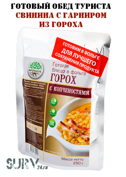 Готовый обед туриста Кронидов "Гороховая каша с беконом и копченостями" - это сытное мясное блюдо, готовое к употреблению. Оно не требует приготовления или кулинарных навыков - достаточно просто вскрыть упаковку и разогреть.