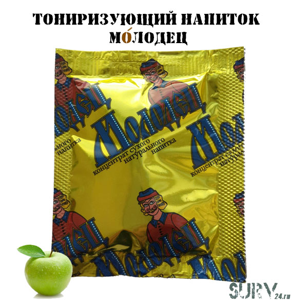 Молодец - это витаминно-адаптогенный напиток со вкусом яблока. Завышенная энергетическая ценность по сравнению с другими напитками серии (доза в 7 раз больше). Снимает симптомы усталости и повышает работоспособность.
