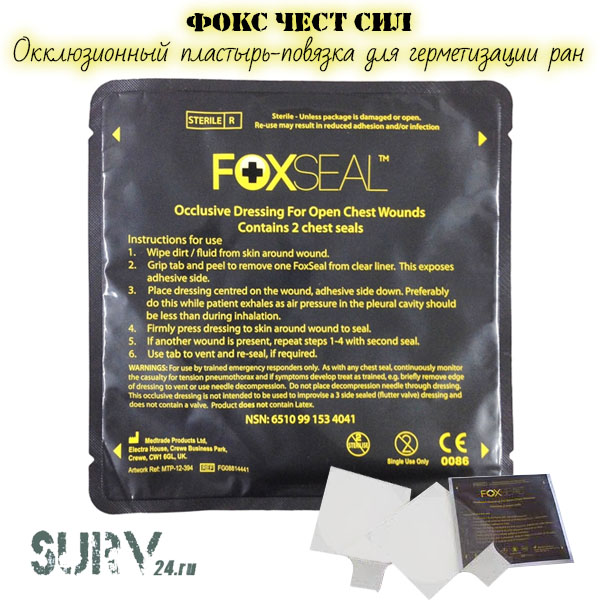 Fox Chest Seal (FoxSeal) - это окклюзионный пластырь в компактной упаковке, используемый для помощи при пневмотораксе и герметизации проникающих ранений груди. Невентилируемый, имеет компактную упаковку, помещается почти в любую аптечку.