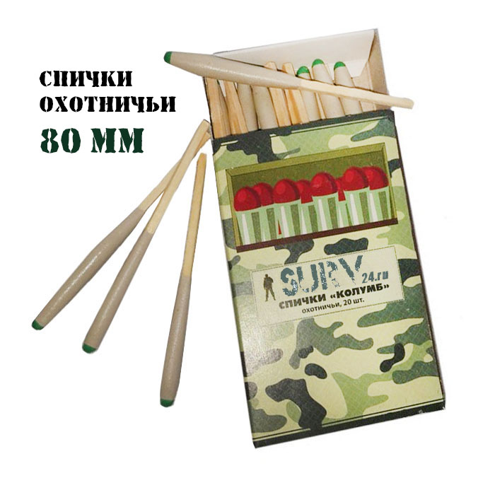 Артикул: Спички охотничьи "Колумб" 80 мм (не гаснут от ветра и влаги, 20 шт упаковка)