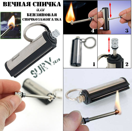 Вечная спичка - это незаменимый помощник в вашем тревожном чемоданчике. Она представляет из себя огниво на манер бензиновых зажигалок "Zippo", что позволяет называть ее "бензиновой спичко-зажигалкой".